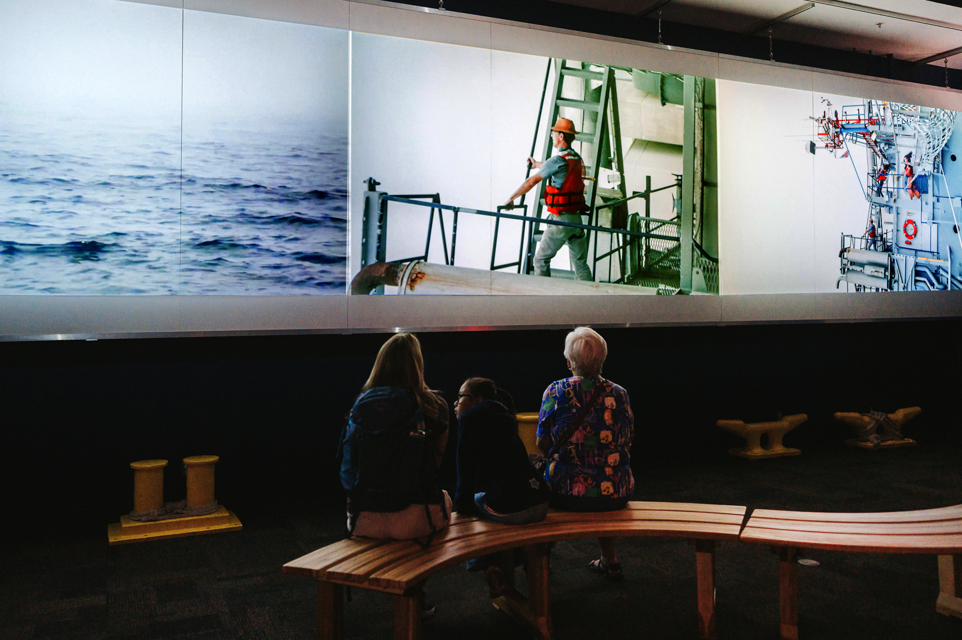 The key fascination of the FLIP is that the vessel appears to capsize with people on board. To reenact this spectacle, artist Rachel Mayeri directed actors on the FLIP as if the vessel were flipping — without ever leaving port. With the simple trick of rotating the frame, the actors appear to be gravitating toward the walls as the room or ship rolls. These scenes activate the disorientating architecture of the vessel. They also echo the mental gymnastics we go through to prepare for the cataclysmic events. The narrative is motivated by the actual procedures of crew and scientists working together to outfit the FLIP for a research voyage, loading and securing scientific instruments, choreographing their movements to each other and the logic of the ship.